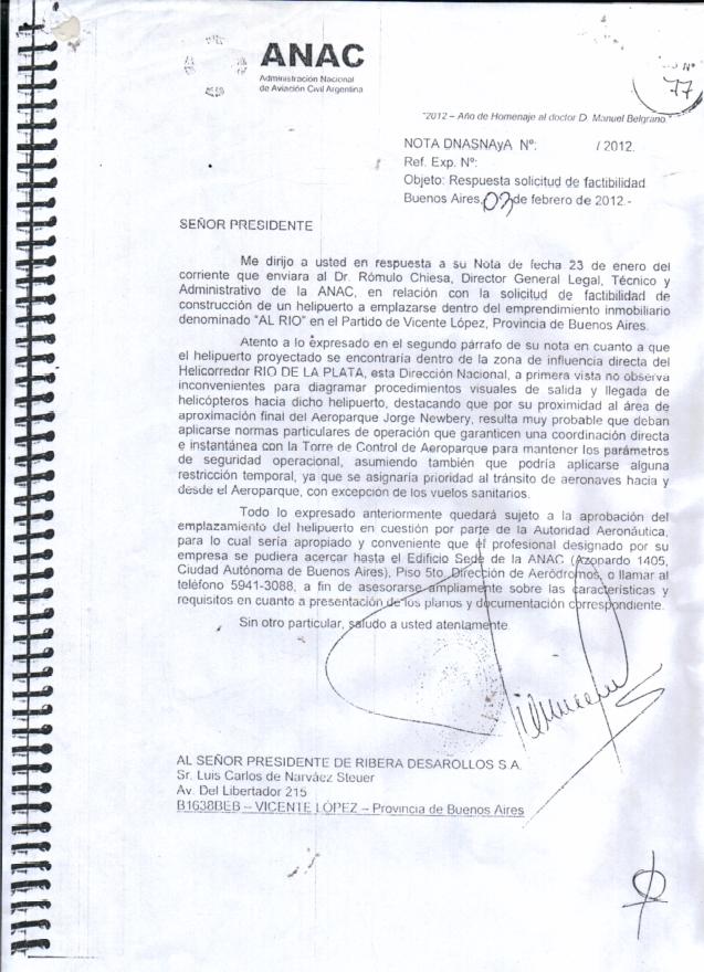 Solicitud de Uso Urbanístico.......De la consulta a la Administración Nacional de Aviación Civil Argentina(ANAC) respecto de la construcción del helipuerto en cuestión, surge que la instalación propuesta NO presenta inconvenientes (Anexo III EIA) , cuando en realidad la nota del ANAC NO EXISTE, se trata de una nota falsa...